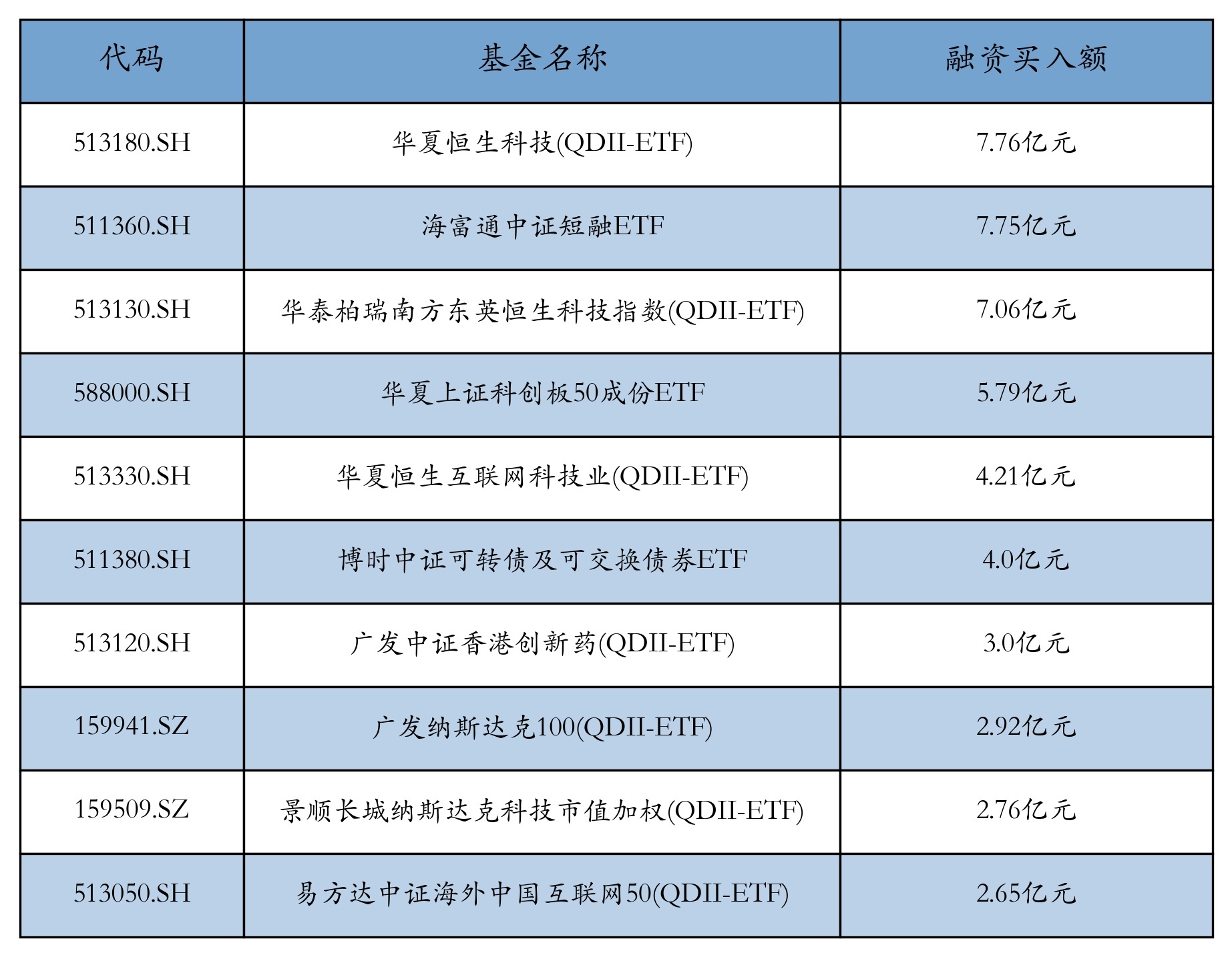 5月9日ETF融资买入额前三位分别为:华夏恒生科技(QDII-ETF)(7.76亿元)、海富通中证短融ETF(7.75亿元)和华泰柏瑞南方东英恒生科技指数(QDII-ETF)(7.06亿元),前10具体见下表: