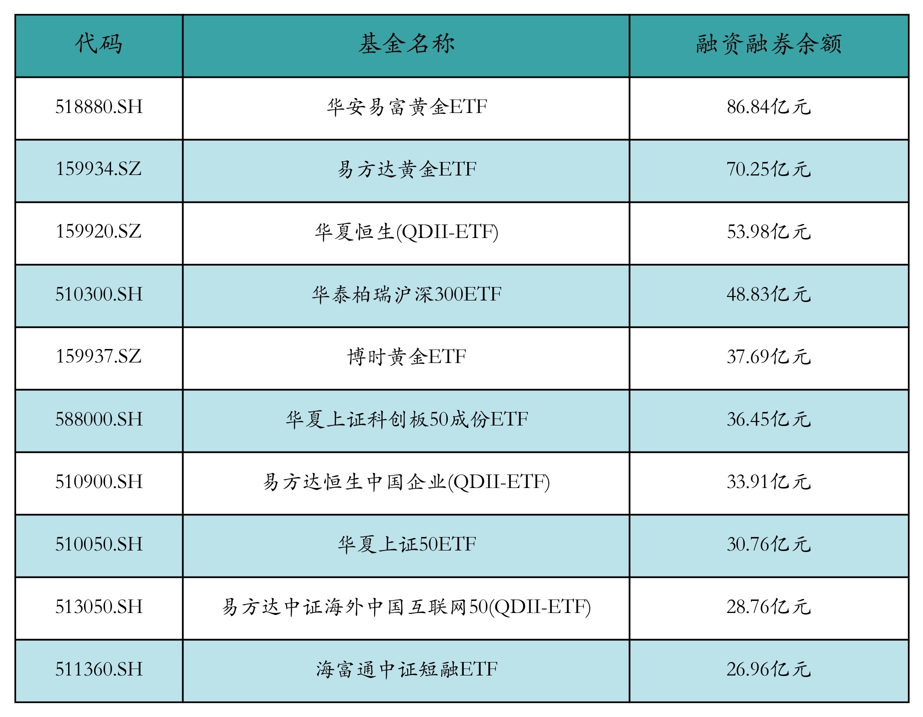 5月9日ETF两融余额前三位分别为:华安易富黄金ETF(86.84亿元)、易方达黄金ETF(70.25亿元)和华夏恒生(QDII-ETF)(53.98亿元),前10具体见下表: