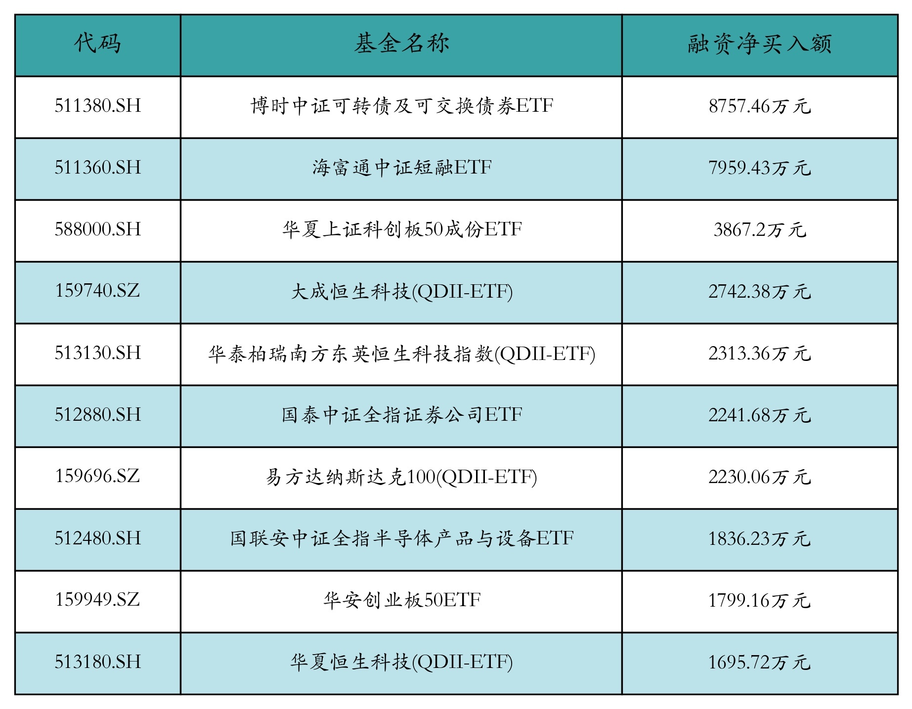 5月9日ETF融资净买入额前三位分别为:博时中证可转债及可交换债券ETF(8757.46万元)、海富通中证短融ETF(7959.43万元)和华夏上证科创板50成份ETF(3867.2万元),前10具体见下表: