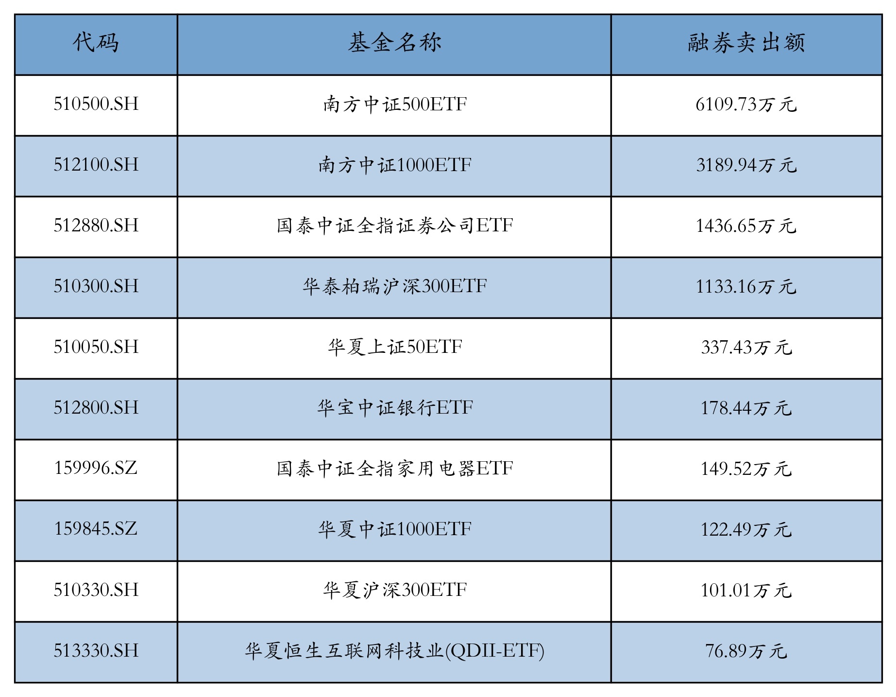 5月9日ETF融券卖出额前三位分别为:南方中证500ETF(6109.73万元)、南方中证1000ETF(3189.94万元)和国泰中证全指证券公司ETF(1436.65万元),前10具体见下表: