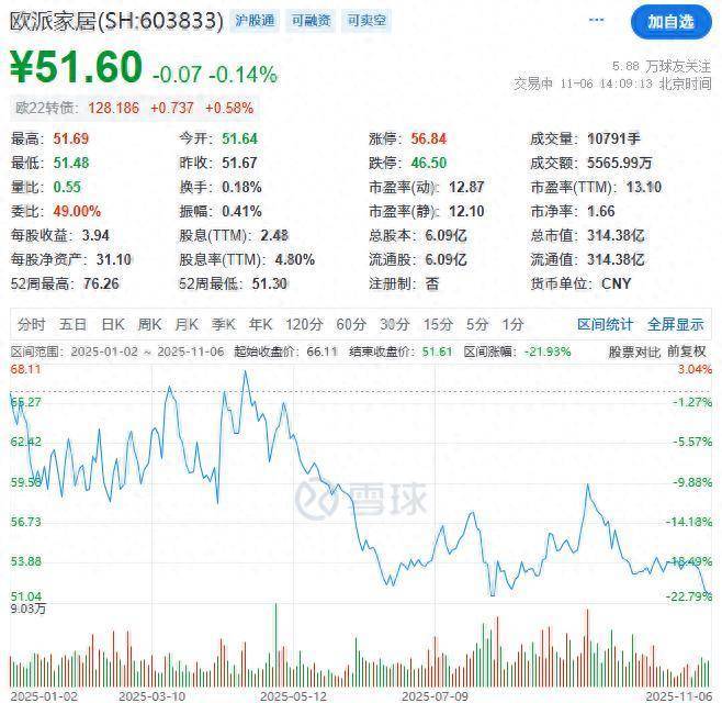 本次剔除的16只A股中就包括欧派家居(603833),今年以来,公司股价下跌21.93%,截至发稿跌0.14%,报51.60元/股。