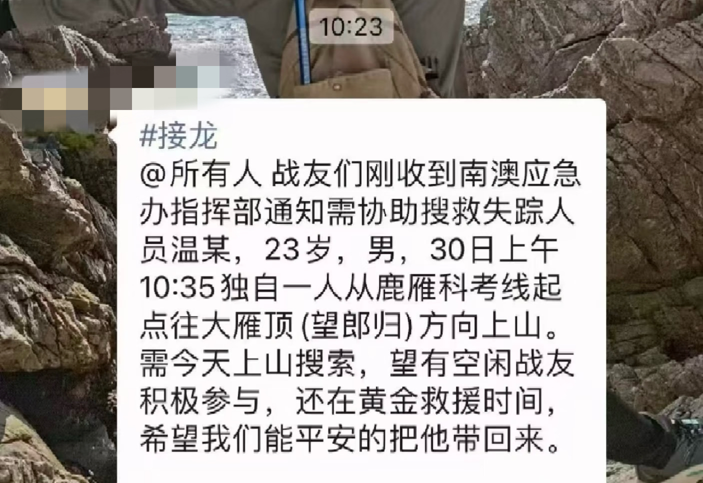 据了解,从30日接到失联消息后,当地便开展了搜寻工作。“我们一直在配合公安进行搜寻工作,出动26人次、4架无人机、4只搜救犬,对大水坑、高崖以及海岸线周边开展搜寻工作,还是没有发现失联人员的线索,今天在继续开展搜寻。”